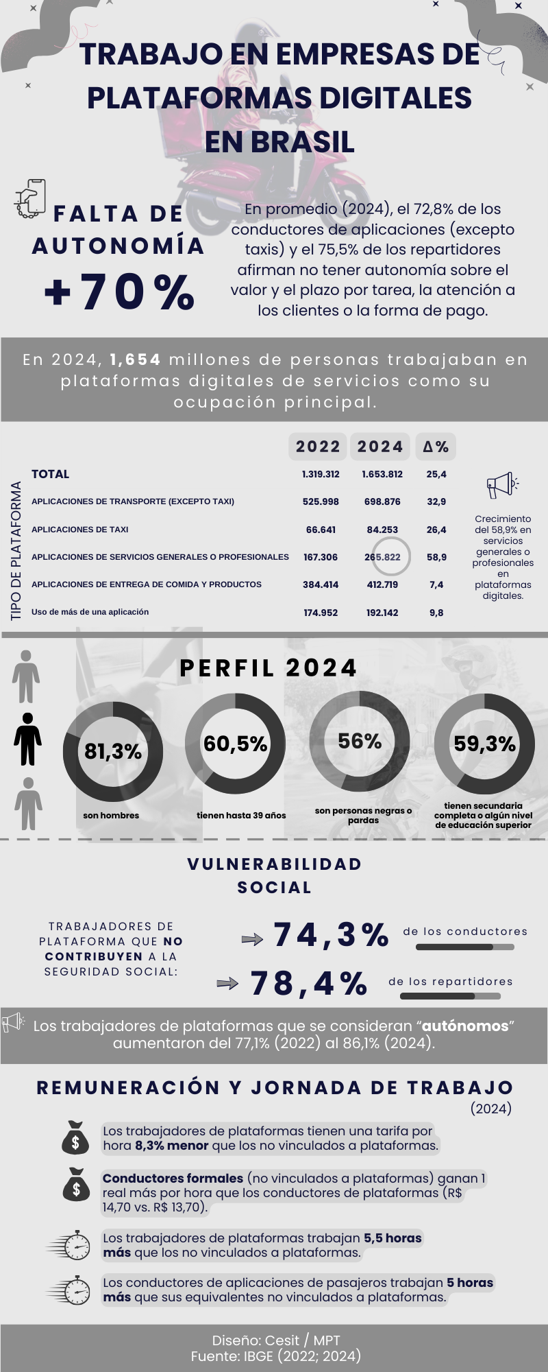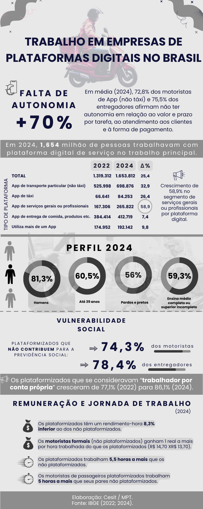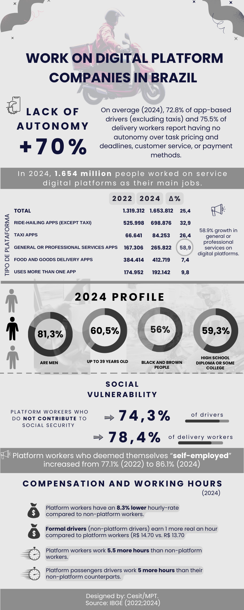 Ademais, os(as) trabalhadores(as) de muitas plataformas digitais estão excluídos(as) de uma série de direitos que garantem condições dignas de trabalho, saúde e segurança e um futuro respaldado pela previdência social.